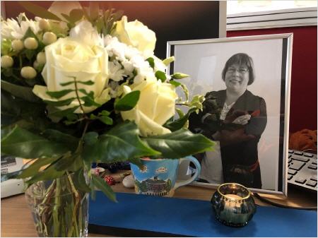 Trauer in der NGZ-Redaktion. Den Schreibtisch von Carina Wernig haben die Kollegen mit einem Foto von ihr und einem Blumengruß geschmückt. Foto: Dirk Neubauer